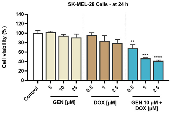 Evaluation of the influence of genistein (GEN; 5, 10, 25 µM), doxorubicin (DOX; 0.5, 1, 2.5 µM), and genistein (GEN) 10 µM - doxorubicin (DOX; 0.5, 1, 2.5 µM) treatments on the viability of SK-MEL-28 cells after 24 h. The results are presented as viability percentages (%) normalized to control (cells without GEN, DOX, or GEN-DOX treatment) and represent mean values ± standard deviation of three experiments performed in triplicate. The statistical differences between groups were verified by applying the one-way ANOVA analysis and Dunnett’s multiple comparisons post-test. Statistical significance is marked with “*” (** p < 0.01; *** p < 0.001 and **** p < 0.0001 versus control).