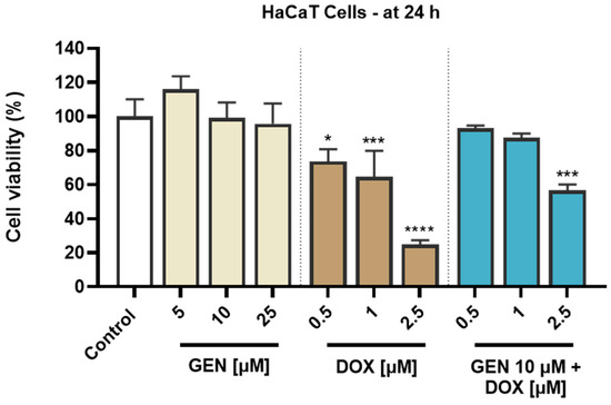 An opposite effect was obtained in HaCaT cells (Figure 2). GEN induced no cytotoxic effects at the tested concentrations of 5, 10, and 25 µM, as the viability reached values of 116.07%, 99.22%, and 95.77% after the 24 h treatment, indicating a slight stimulatory effect at the lowest concentration and a dose-dependent reduction in viability at concentrations equal to and higher than 10 µM. Comparatively, DOX was found to induce a significant cytotoxicity in HaCaT cells after 24 h of treatment, as even at the lowest concentration tested, the viability was <80%. The most significant reductions were obtained at 2.5 µM (24.96%). A significant decrease in cell viability compared to control (to 56.70%) was also obtained when GEN 10 µM was associated with DOX 2.5 µM. However, when GEN 10 µM was added to DOX 0.5 and 1 µM, the viability of HaCaT cells was 92.98% and 87.57%. Overall, the viability values for the GEN–DOX treatment were higher compared to the ones for the individual DOX treatment, suggesting the ability of GEN to reverse the cytotoxicity of DOX in this cell line.