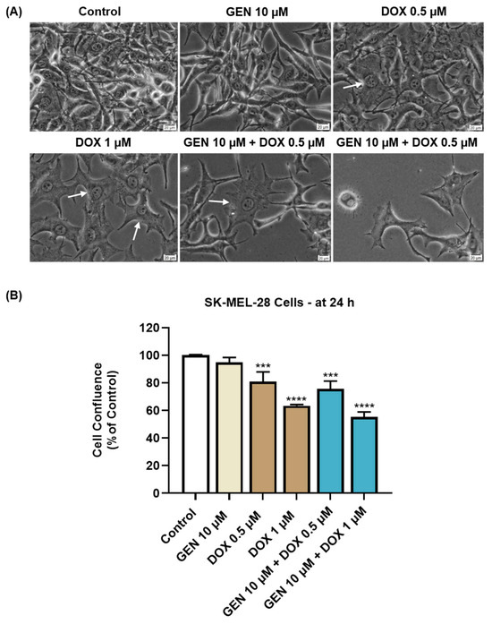 (A) Morphology of SK-MEL-28 cells exposed to GEN (10 µM), DOX (0.5 and 1 µM), and GEN (10 µM) + DOX (0.5 and 1 µM) for 24 h. The scale bars indicate 20 µm. The white arrows indicate cell hypertrophy. (B) Cell confluence determination in SK-MEL-28 cells exposed to GEN (10 µM), DOX (0.5 and 1 µM), and GEN (10 µM)- DOX (0.5 and 1 µM) for 24 h. The results are presented as percentages (%) normalized to control (cells without GEN, DOX, or GEN–DOX treatment) and represent mean values ± standard deviation of three experiments performed in triplicate. The statistical differences between groups were verified by applying the one-way ANOVA analysis and Dunnett’s multiple comparisons post-test. Statistical significance is marked with “*” (*** p < 0.001; **** p < 0.0001 versus control).