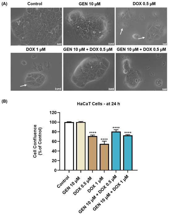 (A) Morphology of HaCaT cells exposed to GEN (10 µM), DOX (0.5 and 1 µM), and GEN (10 µM) + DOX (0.5 and 1 µM) for 24 h. The scale bars indicate 20 µm. The white arrows indicate cell hypertrophy. (B) Cell confluence determination in HaCaT cells exposed to GEN (10 µM), DOX (0.5 and 1 µM), and GEN (10 µM)-DOX (0.5 and 1 µM) for 24 h. The results are presented as percentages (%) normalized to control (cells without GEN, DOX, or GEN–DOX treatment) and represent mean values ± standard deviation of three experiments performed in triplicate. The statistical differences between groups were verified by applying the one-way ANOVA analysis and Dunnett’s multiple comparisons post-test. Statistical significance is marked with “*” (**** p < 0.0001 versus control).