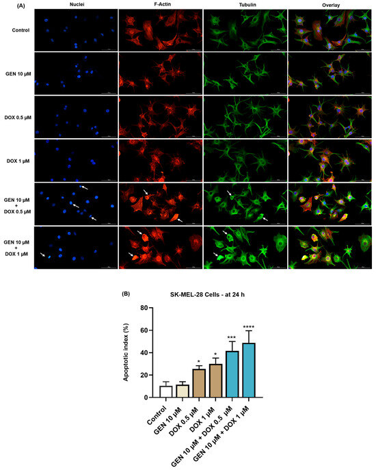(A) Immunofluorescence visualization of nuclei, F-actin, and tubulin in SK-MEL-28 cells exposed for 24 h to GEN 10 µM, DOX 0.5 µM, DOX 1 µM, and GEN 10 µM - DOX (0.5 and 1 µM). The scale bars indicate 100 µm. The white arrows indicate apoptotic-like nuclear and cytoskeletal changes. (B) Calculated apoptotic index values in SK-MEL-28 cells exposed for 24 h to GEN 10 µM, DOX 0.5 µM, DOX 1 µM, and GEN 10 µM-DOX (0.5 and 1 µM). The results are presented as percentages (%) and represent mean values ± standard deviation of three experiments performed in triplicate. The statistical differences between groups were verified by applying the one-way ANOVA analysis and Dunnett’s multiple comparisons post-test. Statistical significance is marked with “*” (* p < 0.05; *** p < 0.001; **** p < 0.0001 versus control).