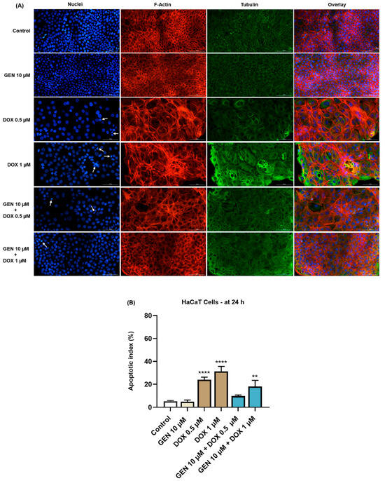 (A) Immunofluorescence visualization of nuclei, F-actin, and tubulin in HaCaT cells exposed for 24 h to GEN 10 µM, DOX 0.5 µM, DOX 1 µM, and GEN 10 µM + DOX (0.5 and 1 µM). The scale bars indicate 100 µm. The white arrows indicate apoptotic-like nuclear changes. (B) Calculated apoptotic index values in HaCaT cells exposed for 24 h to GEN 10 µM, DOX 0.5 µM, DOX 1 µM, and GEN 10 µM + DOX (0.5 and 1 µM). The results are presented as percentages (%) and represent mean values ± standard deviation of three experiments performed in triplicate. The statistical differences between groups were verified by applying the one-way ANOVA analysis and Dunnett’s multiple comparisons post-test. Statistical significance is marked with “*” (** p < 0.01; **** p < 0.0001 versus control).