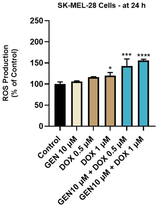 To further confirm the pro-apoptotic properties of GEN–DOX treatments in SK-MEL-28 cells, their efficacy in modulating the activity of caspases-3/7 and -9 was explored (Figure 7). Caspases, which are broadly divided into initiators (e.g., Caspase 9) and effectors (e.g., Caspases 3, 7), play a primordial role in the events occurring during apoptosis [63]. Caspase 3 is directly involved in the apoptotic-specific morphological alterations and DNA fragmentation, while caspase 7 has a higher relevance for cell viability loss [64]. Caspase 9 significantly contributes to the intrinsic (mitochondrial) apoptotic pathway which is triggered by numerous stimuli such as chemotherapy agents, radiation, or stress [65]. Once activated, it can subsequently activate caspases 3 and 7 [66]. The combination therapy of SK-MEL-28 cells with GEN (10 µM) and DOX (0.5 µM and 1 µM) led to a significant increase in the activity of both caspase types, which was higher compared to the GEN- or DOX-individual treatments. The association between GEN and DOX was also reported to induce apoptosis and cell cycle arrest in breast cancer cells [28]. Finally, the influence of GEN–DOX therapy on intracellular ROS levels in SK-MEL-28 cells was assessed. ROS represent a group of highly reactive molecules that, in moderate quantities, contribute to several cellular functions, but when increased, participate in pathological conditions such as tumor initiation and progression [67]. Enhanced levels of ROS also damage intracellular components and organelles and trigger programmed cell death types such as apoptosis [68]. As shown in Figure 8, a significant increase in ROS production in SK-MEL-28 cells after 24 h of treatment was obtained for the GEN (10 µM) + DOX (0.5 µM and 1 µM) associations, which were higher compared to control or the individual treatments. Amplified oxidative stress was also detected in RM-1 prostate cancer cells following their concomitant exposure to GEN- and DOX-loaded polypeptide nanoparticles [29].