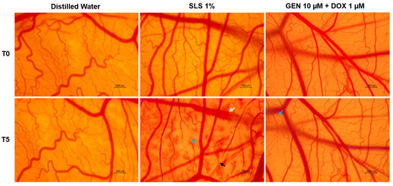 The impact of GEN 10 µM - DOX 1 µM treatment on the vascular structure of the chorioallantoic membrane (CAM) of fertilized chicken eggs. The images at T0 were taken before the application of the treatments, while the ones at T5 were taken 5 min after application. The scale bars indicate 1000 µm. The arrows indicate vascular damage (white—hemorrhage, blue—coagulation, and black—lysis).
