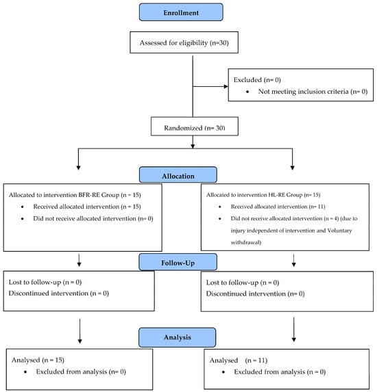 The effects of BFR-RE and HL-RE on quadriceps muscle adaptation were investigated in this study. After group allocation, four participants voluntarily withdrew from the HL-RE group before the interventions commenced. To maintain the integrity of the randomization process, the researchers considered the participants’ initial group assignments for evaluation []. According to the power analysis, since the minimum sample size required was 26 participants, the 4 withdrawals did not compromise the statistical power of this study.