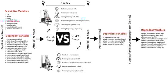 Random assignment was used to allocate participants to one of two intervention groups: (a) BFR-RE (n = 15) and (b) HL-RE (n = 15). Group allocation was performed with 1:1 allocation using an online randomization tool (Urbaniak & Plous, S. Research Randomizer Version 4.0; www.randomizer.org, accessed on 15 March 2025). The BFR-RE group performed bilateral leg extension exercises to volitional exhaustion, with a 90 s rest between sets at 30% of their one-repetition maximum (1RM) while wearing BFR cuffs set to 60% of limb occlusion pressure. The HL-RE group executed the same exercise to volitional exhaustion, with a 90 s rest between sets, but at 70% of their 1RM and without BFR cuffs. Participants were allowed 30 to 90 s of rest between sets, following the National Strength and Conditioning Association (NSCA) recommendations for hypertrophic adaptation []. The tempo for each repetition was established at 2–8 s for both the eccentric and concentric phases, as previous research has indicated that varying repetition tempos within this range can elicit similar hypertrophic responses []. A mobile application (Pro Metronome, Xanin Technology, Berlin, Germany) was used to monitor repetition tempos. Muscle strength and leg extension 1RM were assessed 48–72 h before and after the intervention. Muscle thickness, stiffness, subcutaneous fat thickness, and CSA were evaluated 48–72 h before and one-week post-intervention. The present study deemed a 7-day recovery period as appropriate, following the current evidence []. A standardized 10 min warm-up preceded each training session. Both groups performed bilateral leg extension exercises three times a week (on non-consecutive days) for eight weeks. The training load was adjusted weekly to ensure adherence to the progressive overload. Each participant’s 1RM was determined at the beginning of each week, and training sessions commenced 24 h later. Participants were instructed to refrain from strenuous physical exercise 48 h prior to the testing sessions. However, no specific nutritional recommendations were provided. The details of the study procedures and flow diagrams are presented in Figure 2.
