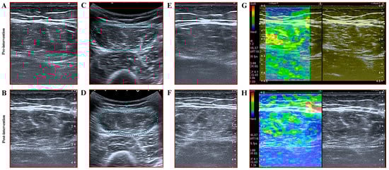 Muscle Thickness, muscle stiffness, subcutaneous fat tissue, and cross-sectional area assessments. Legend. (A): rectus femoris muscle pre-test thickness; (B): rectus femoris muscle post-test thickness; (C): rectus femoris muscle pre-test area; (D): rectus femoris muscle post-test area; (E): subcutaneous fat tissue pre-test; (F): subcutaneous fat tissue post-test; (G): rectus femoris elasto scale pre-test; (H): rectus femoris elasto scale post-test. (A,B): the thickness of the rectus femoris muscle is indicated by dot-shaped white lines, and is measured in mm. (C,D): the rectus femoris muscle cross-sectional area is shown with dotted blue lines, and is measured in cm2. (E,F) The thickness of subcutaneous fat tissue is marked by dotted white lines, and is measured in cm. (G,H): elastography color scale of the rectus femoris muscle of participants before (G) and after (H) exercise.