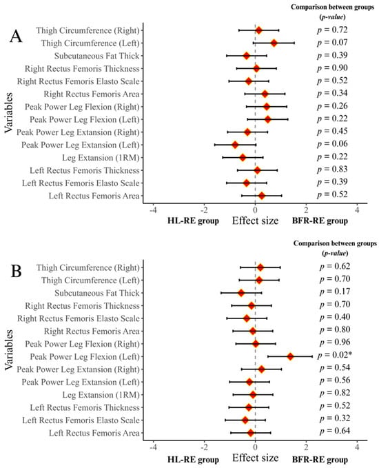 Forest plots based on pre- and post-tests of experimental groups. Legend. (A): pre-test; (B): post-test. BFR-RE—blood flow restricted training; HL-RE—high-load resistance exercise; *: p < 0.05. In this figure, p-values include the comparisons of the groups in the pre-test and post-test. While the comparison results are reported with p-values, the results with significant differences are indicated by *. The positions of the red diamonds in the figure indicate the effect size in favor of that group.
