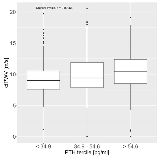 CfPWV was significantly associated with iPTH terciles (first tercile: 9 (7.6–10.5) m/s; second tercile: 9.4 (7.85–11.9) m/s; third tercile: 10.4 (8.5–12.375) m/s; p < 0.001, Figure 1). After correcting for age and heart rate (both do not correlate well with iPTH; Rheart_rate = 0.017, Rage = 0.19), the upper tercile remained significantly associated with an increase in cfPWV (p = 0.0177). A trend towards higher cfPWV within higher iPTH tertiles remains visible in a subgroup analysis based on comorbidities, especially in the coronary, peripheral, and cerebrovascular disease subgroup (see Supplementary Figure S2). The 25(OH)D3 levels did not correlate significantly with cfPWV, and there was no significant impact of albumin-corrected calcium or inorganic phosphate levels on cfPWV.