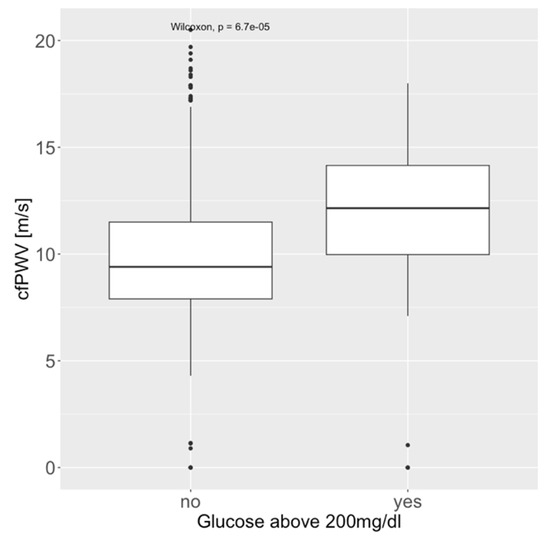 Figure 2. Association of carotid-femoral pulse wave velocity (cfPWV) and serum glucose above 200 mg/dL.