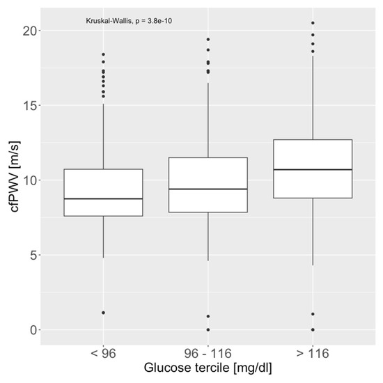 Figure 3. Association of serum glucose levels (terciles) and carotid-femoral pulse wave velocity (cfPWV).