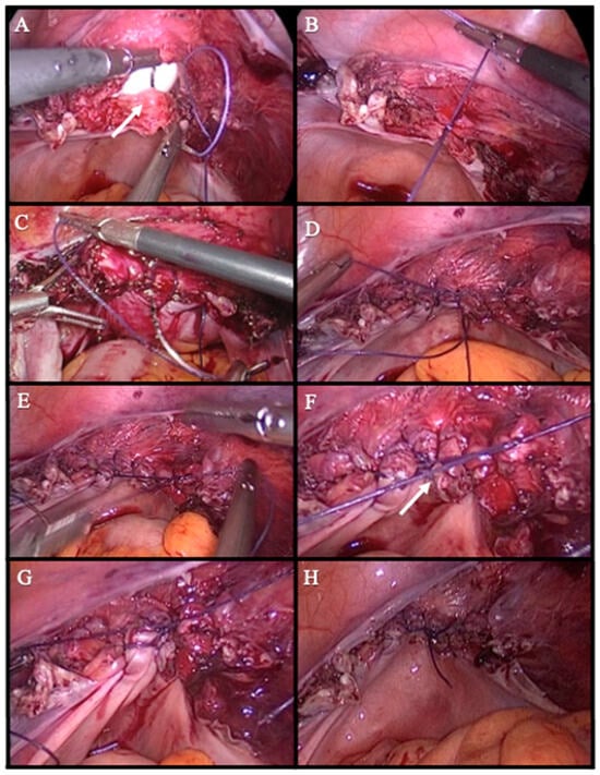 Step-by-step illustration of vaginal cuff closure using anchorflow suture technique. (A) A single Vicryl suture is placed at the midline of the vaginal cuff, incorporating both the anterior and posterior layers. white arrow indicates the midline of the vaginal cuff where the initial suture is placed (B) The first knot is tied to secure and anchor the initial suture. (C) The suture is advanced from the midline toward the right vaginal cuff angle, incorporating the full thickness of the vaginal mucosa and the uterosacral ligament with each pass. (D) The same suture line is continued symmetrically from the midline toward the left vaginal cuff angle. (E) The free end of the suture is approximated to the initial knot at the midline. (F) A final intracorporeal knot is tied at the midline to complete the closure of the vaginal cuff. white arrow shows the point where the final suture is tied (G) Hemostasis is confirmed, and the suture line is inspected for any gaps before concluding the suturing. (H) This technique not only ensures a secure closure but also provides bilateral uterosacral ligament suspension, enhancing pelvic support and reducing the risk of cuff prolapse.