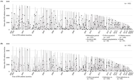 A retrospective chart review was conducted on patients who underwent PD catheter insertion between January 2001 and March 2021. The chart review included all patients aged 18 years or older who were undergoing follow-up in the nephrology division and underwent PD catheter insertion at SCHBC. Patients who had received PD catheter insertion at another hospital and transferred to our center were excluded. The review evaluated medical records, including PD-related procedures, MD usage, and complication diagnoses. Various procedures related to the overall course of PD were listed, and the corresponding electronic data interchange (EDI) codes were identified for each procedure. Among the PD-related MDs used at SCHBC, usage records for adapters, Tenckhoff catheters, and transfer sets were reviewed. The follow-up period was calculated from the insertion date of the initial catheter to the removal date or 30 June 2021, whichever came first. The occurrence of the following seven PD-related complications was reviewed: peritonitis, exit-site infection (ESI), tunnel infection (TI), outflow failure, peri-catheter leak, cuff shaving, abdominal herniation, and catheter cuff extrusion. Among these, peritonitis, ESI, and TI were classified as infectious complications, while outflow failure, peri-catheter leak, cuff shaving, abdominal herniation, and catheter cuff extrusion were classified as non-infectious (mechanical or procedure-related) complications.