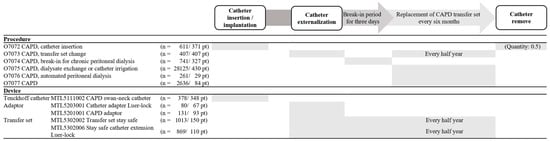 Figure 3 illustrates the clinical progress of PD and the records of PD-related procedures and MD EDI codes. Although catheter insertion and removal are distinct medical procedures, the O7072 code was used for both because no separate EDI code exists for catheter removal. Consequently, catheter removal was recorded under the O7072 code with a claim quantity of 0.5 to account for the difference in procedure complexity. While transfer set changes were performed every 6 months or when complications occurred, the same code (O7073) was used for both routine and complication-driven changes. The code for transfer sets (MTL5302002 or MTL5302006) was entered along with the procedure code (O7073) every 6 months, while the code for the adapter (MTL5203001 or MTL5201001) was only recorded when initially replacing of the CAPD transfer set. The code O7075, which is no longer used, was the most frequently entered code until June 2017, with 28,125 entries in 430 patients. Codes O7076 and O7077 have been in use since July 2017.