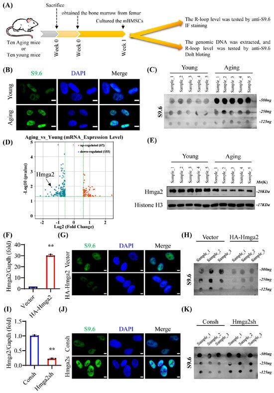 First, the immunofluorescence staining and dot blotting results reveal that the level of R-loops in aging mBMSCs was significantly greater than that in young mBMSCs (Figure 1A–C). Compared with the young mBMSCs, the aging mBMSCs presented a total of 67 upregulated genes and 155 downregulated genes, including Hmga2 (Figure 1D). Furthermore, the Western blot results reveal that the level of Hmga2 was lower in aging BMSCs than in young mBMSCs (Figure 1E). Hmga2 was subsequently overexpressed in aging mBMSCs via retroviral transduction (Figure 1F). The immunofluorescence staining and dot blotting results reveal that Hmga2 overexpression significantly repressed the level of R-loops compared with that in the control group (Figure 1G,H). Hmga2 was subsequently deleted via the transfection of a special shRNA lentivirus (Figure 1I). The immunofluorescence staining and dot blotting results reveal that Hmga2 deletion significantly increased the level of R-loops in aging mBMSCs compared with that in the control group (Figure 1J,K). These results suggest that the expression of Hmga2 was downregulated in the aging mBMSCs, which might have caused the accumulation of R-loops in these cells.