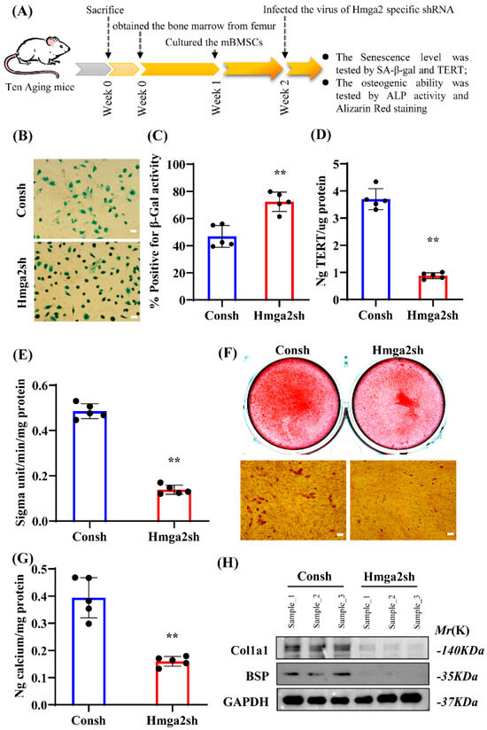 Deletion of Hmga2 increased senescence and repressed the osteogenic differentiation ability of aging mBMSCs. (A) Experimental design. (B) SA-β-gal staining of aging mBMSCs. Scale bar = 200 μm. (C) The percentage of SA-β-gal-positive cells. (D) TERT activity assay in aging mBMSCs. (E) ALP activity assay after osteogenic induction for 5 days. (F) Alizarin red staining results after osteogenic induction for 2 weeks. Scale bar = 200 μm. (G) Quantification of calcium levels after 2 weeks of osteogenic induction. (H) Western blot results showing the expression of Col1a1 and BSP in young and aging mBMSCs. Gapdh was used as the internal control (n = 3). Statistical significance was tested by Student’s t test. The error bars represent the SDs. ** p < 0.01.