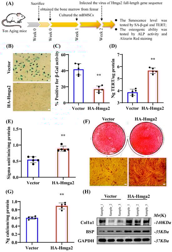 Hmga2 overexpression repressed senescence and promoted the osteogenic differentiation ability of aging mBMSCs. (A) Experimental design. (B) SA-β-gal staining of aging mBMSCs. Scale bar = 200 μm. (C) The percentage of SA-β-gal-positive cells. (D) TERT activity assay in aging mBMSCs. (E) ALP activity assay after osteogenic induction for 5 days. (F) Alizarin red staining results after osteogenic induction for 2 weeks. Scale bar = 200 μm. (G) Quantification of calcium levels after 2 weeks of osteogenic induction. (H) Western blot results showing the expression of Col1a1 and BSP in young and aging mBMSCs. Gapdh was used as the internal control (n = 3). Statistical significance was tested by Student’s t test. The error bars represent the SDs. ** p < 0.01.