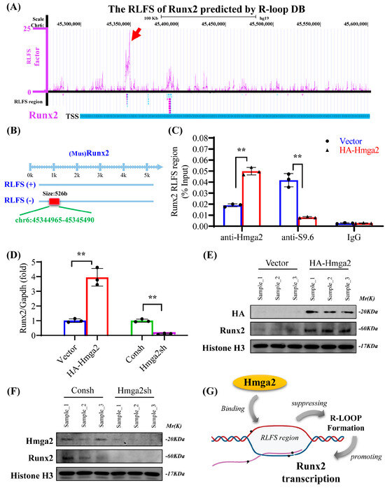 R-loop formation is closely associated with the accumulation of DNA replication stress during the aging process [1]. Excessive R-loop formation leads to replication fork collisions and transcription blockade [18]. For more details, the RLFS in the Runx2, a key transcription factor in osteogenic differentiation, was predicted [22,23,24]. R-loop formation (GC skew-triggered) is often observed between the TSS and the first exon–intron junction. This type of R-loop also produces the G-G-G-G secondary structure on the non-template DNA strand, which further stabilizes the R-loop and suppresses the gene transcription process [25,26]. Hmga2 has three distinct DNA-binding domains, each consisting of 8 or 9 amino acids, which have a high affinity for short A/T-rich sequences [11]. The RLFS region was located mainly at the transcriptional front end of the Runx2 gene. Hmga2 significantly reduced R-loop formation and upregulated the mRNA expression of Runx2. The ChIP and DRIP assays in the RLFS region of Runx2 revealed a significant increase in Hmga2 binding and a decrease in R-loop formation. These suggest that Hmga2 upregulates Runx2 expression by repressing R-loop formation in aging mBMSCs.