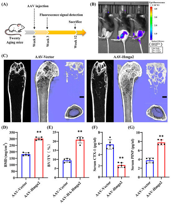 Hmga2 overexpression alleviated the bone loss phenotype in aging mice. (A) Experimental design. (B) Fluorescence signal in aging mice. (C) Micro-CT image and 3D reconstruction of the femur of aging mice. (D,E) Bone histomorphometry indices of BMD (D) and BV/TV (E). (F,G) The levels of CTX-1 (F) and PINP (G) in the serum were detected via ELISA. Statistical significance was tested by one-way ANOVA or Student’s t test. The error bars represent the SDs (n = 5). Scale bar = 250 μm. ** p < 0.01.