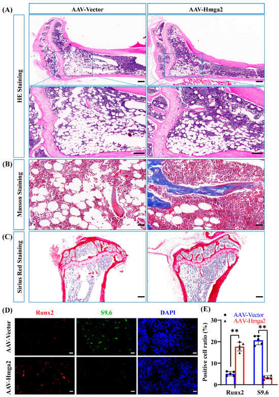 HE staining revealed that the number of trabecular structures and bone marrow cells in the AAV-Hmga2 group was significantly greater than that in the control group, indicating a denser and less vacuolar structure (Figure 6A). Masson staining was used to visualize collagen remodeling in the bone marrow under the growth plate (immature collagen in blue and mineralized collagen in red), and that in the AAV-Hmga2 group was significantly greater than that in the control group (Figure 6B). Sirius red staining revealed that the AAV-Hmga2 group contained more fibers, and the width of the growth plate in the AAV-Hmga2 group was wider than that in the control group (Figure 6C). Immunofluorescence staining and quantitative analysis revealed that the level of S9.6 in the bone marrow was significantly lower in the HA-Hmga2 group than in the control group (Figure 6D,E). Additionally, the expression level of Runx2 was significantly greater in the HA-Hmga2 group than in the control group (Figure 6D,E). These results indicate that Hmga2 repressed the R-loop level and upregulated the expression of Runx2 in the bone marrow of the aging mice. The Hmga2 treatment enhanced bone matrix remodeling in the aging mice.