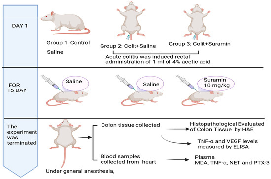 The 20 colitis-induced rats were randomly divided to two groups. Group 1 received 0.9% NaCl (1 mL/kg/day, intraperitoneally), and Group 2 received suramin (10 mg/kg/day, intraperitoneally; Merck Sigma-Aldrich, USA). Treatments were carried out over 15 days. Upon completion of the study, the rats were euthanized. Blood samples were obtained through cardiac puncture for biochemical analysis, and colon tissues were harvested for tissue examination and biochemical assessment (Figure 1).