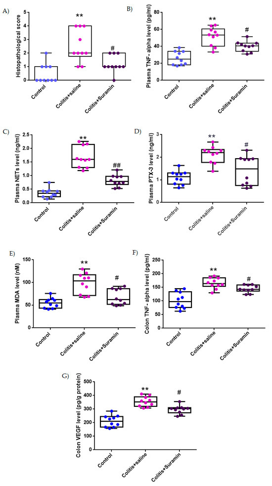 Box plots representing histopathological scores (A), plasma levels of TNF-α (B), NETs (C), PTX3 (D), and MDA (E), and colonic levels of TNF-α (F) and VEGF (G) in control, colitis + saline, and colitis + suramin-treated groups. Data are presented as mean ± SEM. Statistical significance was evaluated by one-way ANOVA followed by Tukey’s post hoc test, except for histopathological score, which were analyzed using Kruskal–Wallis test followed by Mann–Whitney U test. ** p < 0.01 vs. control group; # p < 0.01, ## p < 0.001 vs. colitis + saline group.