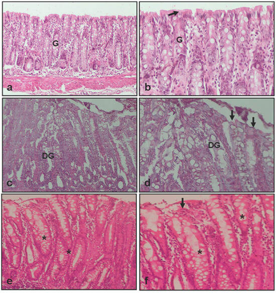 Light microscopical images of colon from experimental groups. (a,b) Colon tissue of control group, showing normal epithelium (arrow) and gland (G); (c,d) colon tissue of colitis +0.9% NaCl group, showing disrupted epithelium (arrow) and degenerated gland (DG); (e,f) colon tissue of colitis +10 mg/kg suramin group, showing healed epithelium (arrow) and gland (*): Hematoxylin and eosin, ×0 and ×20.