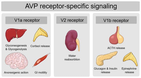 Lastly, based on the findings from these knockout studies, Brattleboro rats—genetically lacking AVP and widely used as a model for studying central AVP deficiency—are expected to display glucose-intolerant phenotype []. Nevertheless, Brattleboro rats show enhanced glucose tolerance, with lower insulin levels, low glucose levels during glucose tolerance tests and enhanced insulin sensitivity compared to wild-type rats, which suggests that AVP acts on glucose metabolism not only by V1aR/V1bR signaling but also by altering the water homeostasis through V2R signaling []. Figure 2 summarizes AVP functions based on different receptor deficiencies.