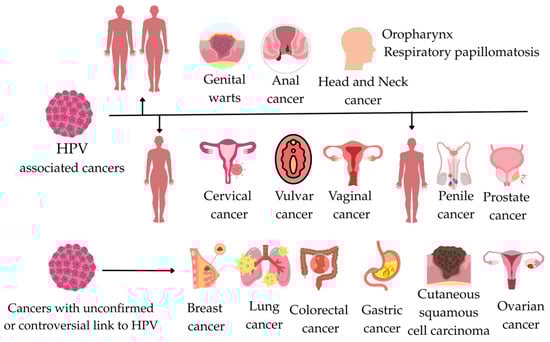 - Mukherjee, A.G.; Ramesh Wanjari, U.; Valsala Gopalakrishnan, A.; Jayaraj, R.; Katturajan, R.; Kannampuzha, S.; Murali, R.; Namachivayam, A.; Evan Prince, S.; Vellingiri, B.; et al. HPV-Associated Cancers: Insights into the Mechanistic Scenario and Latest Updates. Med. Oncol. 2023, 40, 212. [Google Scholar] [CrossRef]