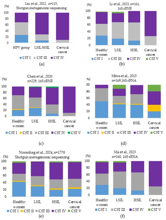 - Liu, Y.; Wang, S.; Liu, J.; Su, M.; Diao, X.; Liang, X.; Zhang, J.; Wang, Q.; Zhan, Y. Characteristics of Vaginal Microbiota in Various Cervical Intraepithelial Neoplasia: A Cross-Sectional Study. J. Transl. Med. 2023, 21, 816. [Google Scholar] [CrossRef] [PubMed]