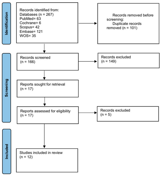 The literature search was conducted across five databases: Web of Science, Cochrane Central, Scopus, PubMed, and EMBASE, identifying a total of 267 studies (63 from PubMed, 121 from EMBASE, 35 from Web of Science, six from Cochrane Central, and 42 from Scopus). After removing 101 duplicates, 166 studies remained for eligibility screening. Subsequently, 148 studies were excluded, leaving 17 for full-text review. Ultimately, 12 studies published between 1994 and 2021 were included in the qualitative synthesis. The PRISMA flow diagram summarizes the study selection process (Figure 1).