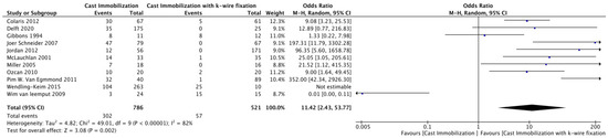 Forest Plot Comparing Complication Rates Between Cast Immobilization and K-Wire Fixation [14,15,16,17,18,19,21,22,23,24].