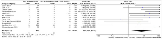 - Sengab, A.; Krijnen, P.; Schipper, I.B. Displaced distal radius fractures in children, cast alone vs additional K-wire fixation: A meta-analysis. Eur. J. Trauma Emerg. Surg. 2019, 45, 1003–1011. [Google Scholar] [CrossRef] [PubMed] [PubMed Central]