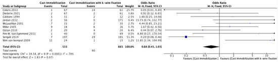 About the comparing complication rates between cast immobilization and K-wire fixation, our study revealed that there is no significant relationship between the complication rates between the cast immobilization group and K-wire fixation group, OR: 0.68 (95% CI: 0.45–1.03, p = 0.07). This is like the results of Miller et al. [17], who reported a complication rate in the cast immobilization group compared with the K-wire group, with the results of 44% and 38%, respectively. However, the nature of the complications differed significantly [17]. These findings suggest that while complication rates may be similar, K-wire complications are generally less severe than cast-treated patients, which sometimes require surgical correction.