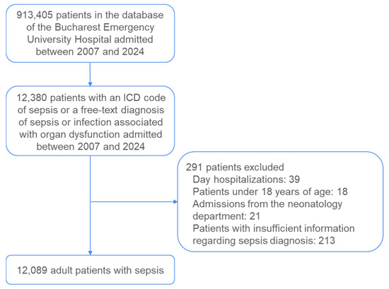 Adult patients with sepsis, admitted to the University Emergency Hospital in Bucharest between 1 January 2007 and 31 December 2024 were identified based on a pre-specified list of International Classification of disease (ICD-10) codes (see Supplementary Table S1). Patients who had a primary or secondary sepsis diagnosis ICD code or had a sepsis diagnosis listed among the conditions recorded as free-text were selected. In our study, the term ”free-text diagnosis” refers to clinical diagnoses entered manually by physicians into non-structured text fields within the hospital’s electronic medical record (EMR) system, rather than selecting from standardized ICD-10 diagnostic codes. These entries typically describe the patient’s condition in the clinician’s own words at the time of discharge or during hospitalization (e.g., “urosepsis”, “septic shock secondary to pneumonia”), often providing additional clinical nuance that may not have been fully captured by codified diagnoses.