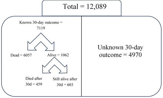 The left side represents the 7119 patients whose 30-day outcome was known—this includes those who died within 30 days or were still hospitalized at 30 days (459 who died after 30 days and 603 still alive after 30 days). The right side represents the 4970 patients who were discharged alive before 30 days but for whom no follow-up data were available—thus their survival status at 30 days is unknown. These two groups are mutually exclusive and together make up the total study population of 12,089 patients.