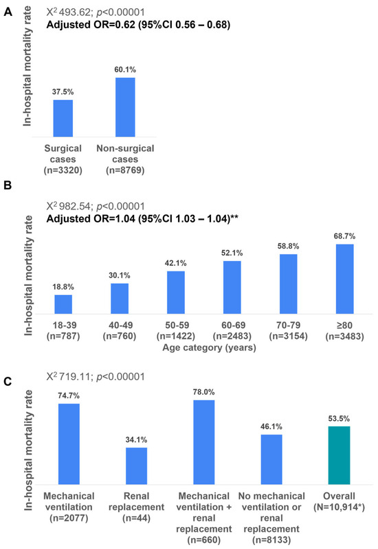 In-hospital mortality rates based on surgical/non-surgical categories (panel (A)), age categories (panel (B)), and receipt of mechanical ventilation with or without renal replacement (panel (C)). * Among patients recorded between 2011 and 2024. ** Variables included in the adjustment: age, sex, surgical status, presence of comorbidities. Age is considered as a continuous variable in the multivariate analysis. OR—odds ratio; CI—confidence interval.