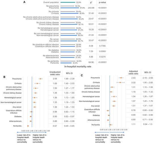 Conversely, the impact of diabetes, atherosclerosis, and clostridium difficile infection on in-hospital mortality was marginal in both the unadjusted and adjusted analyses. Notably, peritonitis was associated with a reduced risk of in-hospital death in the unadjusted analysis; however, after adjusting for age, sex, receipt of surgery, and presence of other comorbid conditions, the association was no longer significant (Figure 4B,C). These findings highlight the substantial impact of respiratory, hepatic, renal, and oncological conditions on patient outcomes, emphasizing the need for targeted interventions in high-risk groups.
