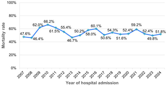 Between 2007 and 2024, the yearly in-hospital mortality rates among patients with sepsis varied between 46.4% (in 2008) and 66.2% (2010), with no obvious trends over time (Figure 5).