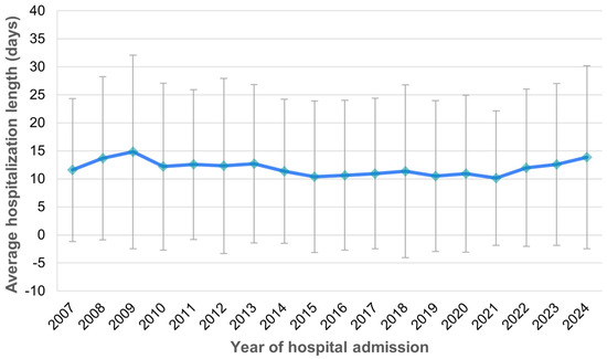 The mean duration of hospitalization was 11.8 days (SD 14.3 days), ranging from a minimum of 0 to a maximum of 213 days, with a median length of stay of 8 days. The average hospitalization length remained consistent over time between 2007 and 2024 (Figure 6).