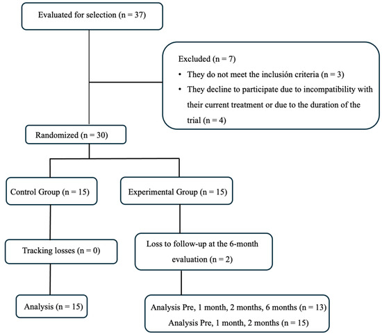Thirty-seven individuals were assessed for eligibility. Of these, seven were excluded: three of them did not meet the inclusion criteria, and four declined participation due to incompatibility with their current treatment or the duration of the trial. No additional reasons for exclusion were reported (Figure 1). All participants were recruited from Hospital Niño Jesús in Madrid.