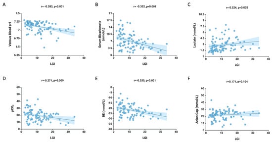 Concerning the parameters of arterial blood gas, a negative correlation was observed between LGI values and venous blood pH (r = −0.383, p < 0.001), serum bicarbonate (r = −0.352, p < 0.001), pCO2 (r = −0.271, p = 0.009), and BE (r = −0.330, p < 0.001). Conversely, a positive correlation was established with lactate values (r = 0.324, p = 0.002) (Figure 1). No statistically significant correlation was observed between LGI values and the anion gap (r = 0.171, p = 0.104).