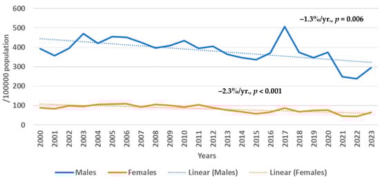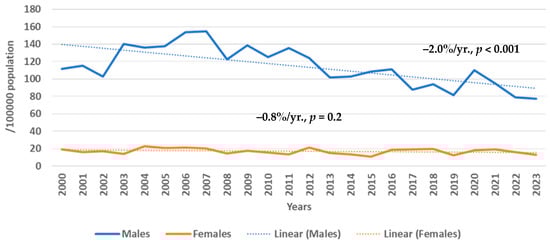 The age-standardized mortality from IHD is presented in Figure 2. It was found that the mortality from IHD rates in males was, on average, three–four times higher than in females. During 2000–2023, it was observed that in the 25–64-year-old male population age-standardized mortality from IHD significantly decreased (−2.0%/yr., p < 0.001), whereas in the female population it was without significant changes.