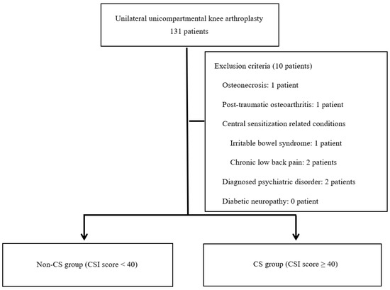 Data from 131 patients who underwent unilateral UKA between 2014 and 2022 were initially included in the study. The inclusion criteria were as follows: (1) isolated medial compartment OA with an intact anterior cruciate ligament, (2) correctable varus deformity (less than 10 degrees), (3) minimum two-year follow-up period, and (4) no history of prior knee surgery on the affected side. Patients were excluded if they had: inflammatory arthritis (e.g., rheumatoid arthritis), osteonecrosis affecting the knee joint (1 patient), post-traumatic OA (1 patient), a history of knee infection, a documented history of CS-related conditions such as irritable bowel syndrome (1 patient) and chronic low back pain (2 patients), prior use of centrally acting agents or patients with diagnosed psychiatric conditions known to affect CS, such as anxiety or depressive disorders (2 patients), incomplete clinical outcome data (2 patients), or a subsequent operation on either knee during the follow-up period (1 patient). All patients were clinically screened for signs of peripheral neuropathy, including diabetic neuropathy, through neurologic examination and medical history review. Patients with confirmed or suspected peripheral neuropathy were excluded from the study. Notably, none of the enrolled participants exhibited clinical evidence of peripheral neuropathy. Following the application of those criteria, 10 patients were excluded from the study, resulting in a final cohort of 121 patients (Figure 1). All analyses were limited to patients who met the criteria for medial UKA, stratified by CS status. Patient demographics and baseline characteristics, including body mass index (BMI), comorbidities, and preoperative functional status, were collected through medical records and patient-reported questionnaires.