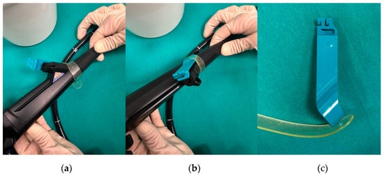 (a,b) Two views from different angles of the RX locking system (Boston Scientific) mounted on the duodenoscope; (c) the RX locking device disassembled, showing its components: a rubber clamp that is fixed externally to the working channel port and a plastic locking mechanism that secures the guidewire in place.