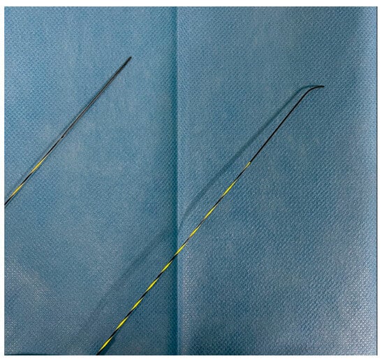 Guidewires for biliopancreatic endoscopy feature with different morphologies of the distal tip: straight, angled, and J-shaped. The length of the tip varies between different versions, typically ranging from 3 to 10 cm. Since the tips are usually hydrophilic, longer tips are believed to offer greater lubrication to facilitate selective cannulation, and radiopaque markers present on the guidewire tip aid in movement and measurements under fluoroscopic guidance. Angled guidewires typically offer high torqueability and tip flexibility, providing selective cannulation, navigation of strictures, and advancement in challenging lumens potentially reducing complications like ductal perforation and PEP, though clinical data are limited [] (Figure 2). Vihervaara et al. conducted an RCT to compare the efficacy of hydrophilic angled-tip and straight-tip guidewires in biliary cannulation. The study included 155 patients randomized into two groups: 72 with an angled-tipped guidewire and 83 with a straight-tipped guidewire. While the success rate of primary biliary cannulation was similar between the groups (60% vs. 65%, p = 0.61), the angled-tipped guidewire achieved deep cannulation significantly faster (median 20 s vs. 63 s). The overall complication rates were comparable in both groups. The limitations of this study are the relatively small number of patients and the slightly unequal number of patients in the study arm []. Hausmann et al. conducted a multicenter randomized trial to compare the performance of four different modern guidewires in different ERCP scenarios, analyzing tip shape (angled vs. straight). The primary outcome was the success rate of ERCP completion, while procedure time was a secondary endpoint. The results showed that angled-tip guidewires had the highest success rate for native papilla intubation (88.9%) and overall interventions (87.5% vs. 79.9%), particularly for intrahepatic strictures (89.5% vs. 67.8%). Crossover attempts favored angled-tip guidewires, adding 12.6% success after straight-tip failure, while switching to straight-tip guidewires after angled-tip failure provided minimal benefit (3.4%). Based on these findings, angled-tip guidewires can be recommended as the first choice for ERCP, especially for intrahepatic strictures. The limitations are the non-blinded design of the study, the only use of hydrophilic guidewires, and the relatively small number of patients included in the pancreatic group []. Pancreatic duct cannulation is often challenging due to anatomical factors. While traditional J-tipped guidewires are useful for biliary cannulation [], their large tip radius makes them unsuitable for pancreatic interventions. However, a newly developed small J-tipped guidewire with a reduced loop size has enabled safer and more effective pancreatic procedures. A retrospective single-center study comparing this guidewire to an angled-tip guidewire in 294 patients (114 in the small J group and 180 in the angled group) found a significantly higher success rate with the small J-tipped guidewire (76% vs. 47%, p < 0.001). It remained an independent predictor of success, even in complex cases like chronic pancreatitis or sharp ductal angles. Additionally, in a retrospective study, the small J-tipped guidewire was associated with a lower incidence of post-ERCP pancreatitis (3.5% vs. 12.2%, p = 0.01), likely due to its looped tip reducing pancreatic duct trauma [] (Figure 2).
