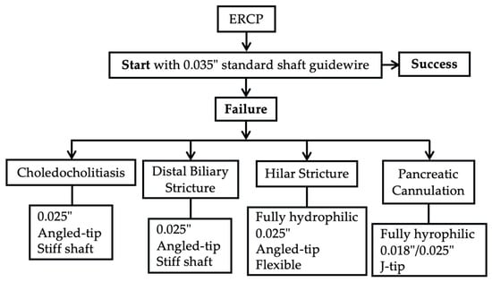 Algorithm for guidewire selection to optimize ERCP success. The procedure typically begins with a 0.035” hydrophilic-tipped, standard shaft guidewire. In case of technical failure, guidewire choice is adapted based on the clinical indication such as choledocholithiasis, distal or hilar strictures, or pancreatic duct cannulation, with tailored strategies for each scenario to enhance cannulation success and procedural efficiency.
