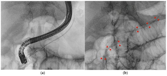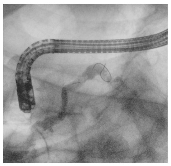 Guidewires are generally safe and easy to handle, with the most significant directly related issue being bile or pancreatic duct perforation (type 3 perforation following Stapfer classification), which is rare and typically identified during the procedure by contrast leakage outside the biliary or pancreatic system []. Guidewire-related perforation often occurs locally around the ampulla of Vater forcing the entry of a guidewire when biliary cannulation is difficult []. A meta-analysis found that ERCP-related perforations remain uncommon (0.39%), of which guidewire-related perforations accounted for 16% []. Management usually involves conservative treatment, including antibiotic therapy and the placement of a fully covered self-expandable metal stent (FC-SEMS) if the bile duct is ultimately cannulated [,]. Reported mechanism of fractured guidewire include forced traction, imperfection in the painted Teflon guidewire coating, electrical short circuits between cutting wire and guidewire, and detachment of the floppy tip from the shaft. Successful retrievals of the fractured guidewire from the MPD are rarely reported []. Acute and long-term biliopancreatic complications are only anecdotally reported, such as a case of cholangitis related to hydrophilic guidewire fracture []. Therefore, a conservative management approach can be suggested without the need to retrieve the wire fragment []. Inadvertent portal vein cannulation or stenting has also been reported in the literature, especially in cases of malignant etiologies that distort local anatomy. While the majority of portal vein cannulation or stenting merely needs the withdrawal of a catheter or stent, an interventional radiologist should be involved early, given an unexpected risk of torrential bleeding that may require portal vein or common bile duct stent grafting [].