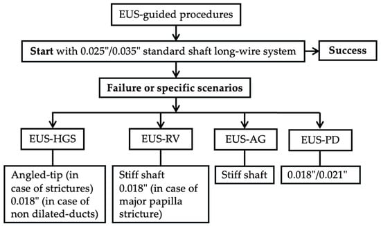 EUS-guided procedures, including EUS-guided biliary drainage (EUS-BD), pancreatic drainage (EUS-PD), and drainage of pancreatic fluid collections, are increasingly being used in clinical practice []. A key advantage of EUS guidance is its flexibility in choosing access points based on patient and ductal anatomy. In this context, selecting the optimal puncture site and effectively manipulating the guidewire within the ducts are crucial steps. Figure 6 provides a procedural algorithm outlining primary and secondary guidewire choices, highlighting contingency strategies in case of a failed wire advancement. Notably, a 19-gauge EUS needle can accommodate guidewires up to 0.035 inches, while a 22-gauge needle is limited to guidewires up to 0.021 inches [].