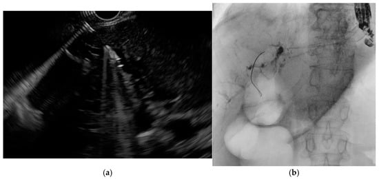 - Yane, K.; Yoshida, M.; Imagawa, T.; Morita, K.; Ihara, H.; Hanada, K.; Hirokawa, S.; Tomita, Y.; Minagawa, T.; Okagawa, Y.; et al. Usefulness of endoscopic ultrasound-guided transhepatic biliary drainage with a 22-gauge fine-needle aspiration needle and 0.018-inch guidewire in the procedure’s induction phase. DEN Open 2024, 4, e297. [Google Scholar] [CrossRef]